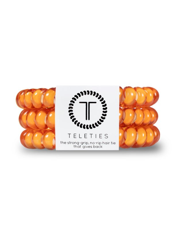 Hold your hair and enhance your style with TELETIES. The strong grip, no rip hair tie that doubles as a bracelet. Strong, pretty and stylish, TELETIES are designed to withstand everyday demands while taking your look to the next level. 100% of the proceeds from this pack will go to All Hands and Hearts, an organization that directly assists with immediate disaster relief and rebuilding efforts in the aftermath of Hurricane Dorian. Sold in packs of three. The small size is 4.5cm wide x 0.5cm thick.